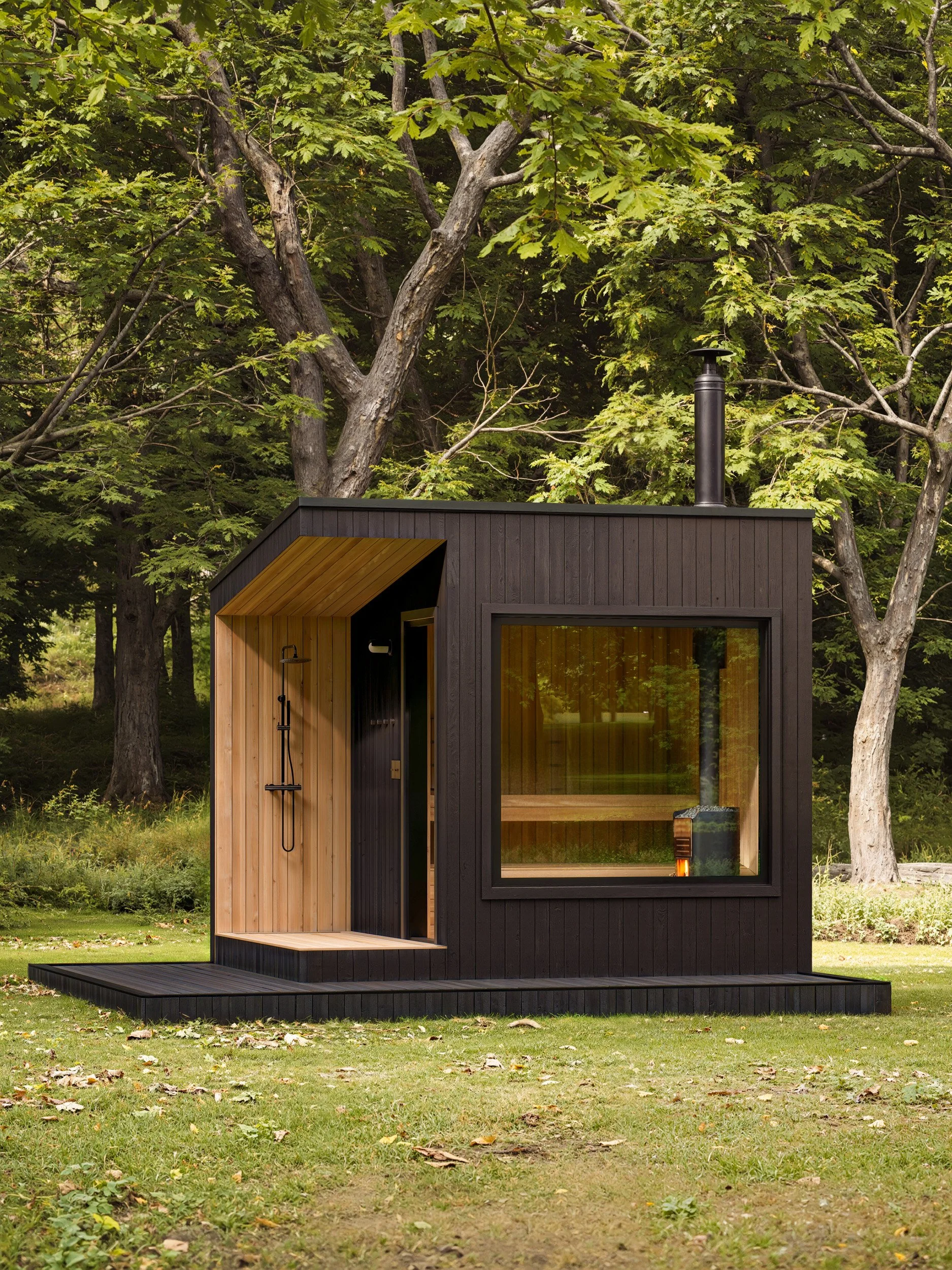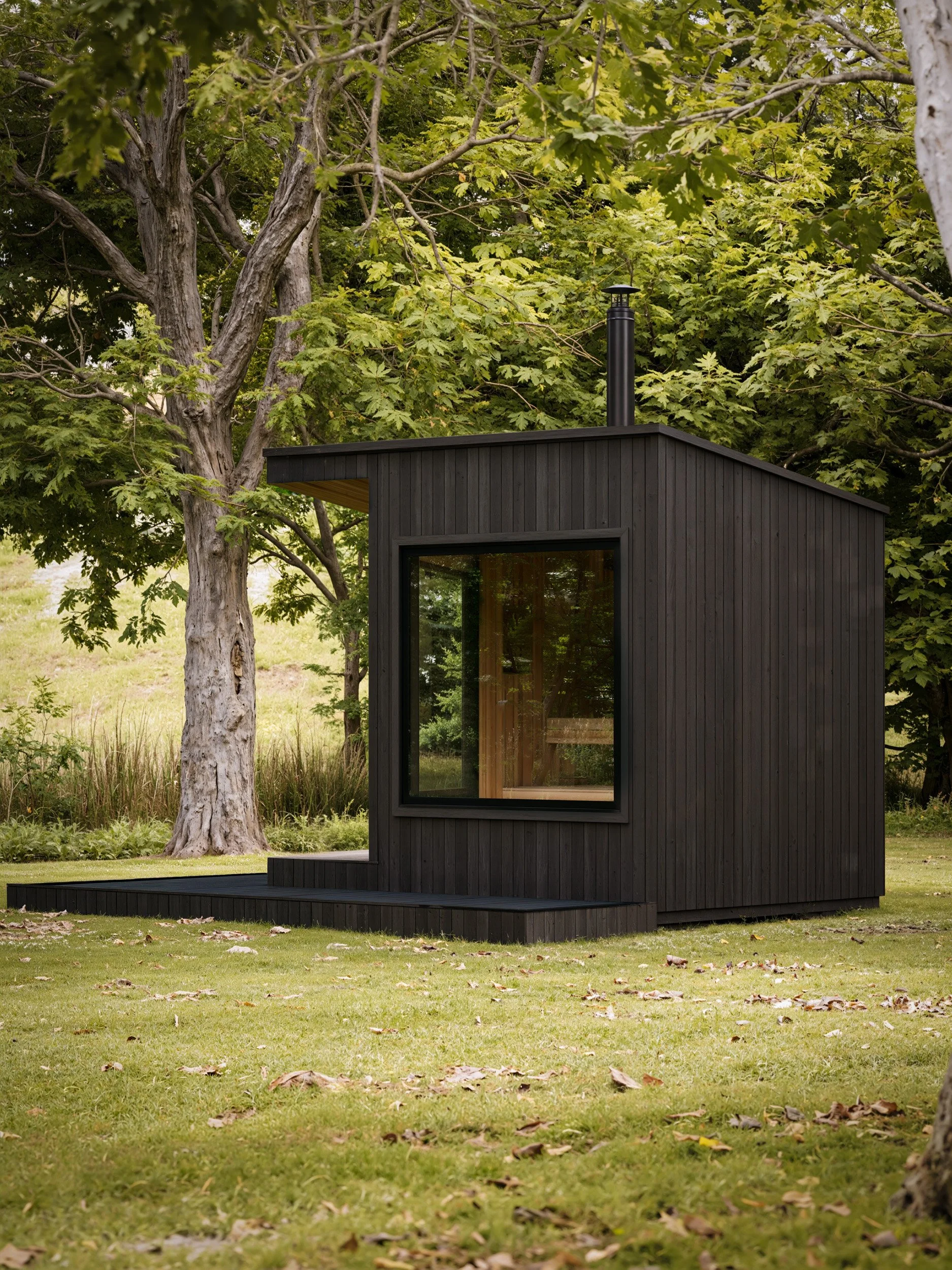 The Eave Sauna is defined by its strong architectural profile and refined, sleek black wood, with clean lines and warm surfaces that feel both modern and timeless. Designed as a wood-fired or electric sauna for daily ritual and restoration, its interior creates a calm, immersive environment focused on heat, light, and stillness. Built in the USA with durable, high-quality materials and delivered ready for use, the Eave Sauna balances performance with intentional design. Whether positioned as a standalone retreat or paired with a Field+Fold cabin, it offers a grounded, visually striking approach to wellness no matter where it is installed.