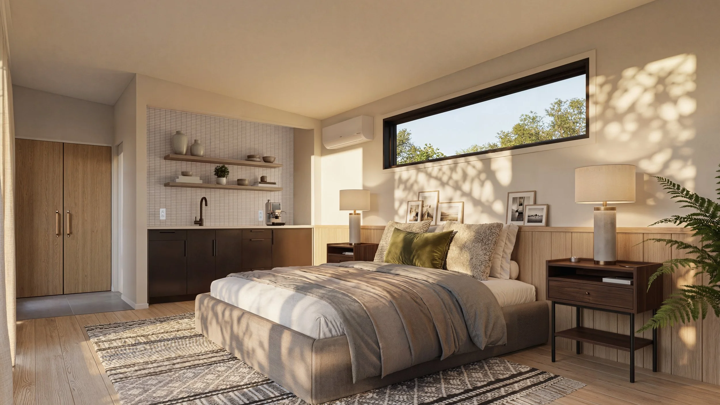 The Juniper Cabin is a thoughtfully designed studio cabin created for refined, efficient living in nature. Its open, light-filled interior balances comfort and simplicity, with carefully integrated living, sleeping, and relaxing spaces that make the most of a compact footprint. There is a kitchenette and full bathroom, creating a light-filled luxury hotel experience, while surrounding you in nature. Built in the USA with elevated, durable materials and delivered fully finished, the Juniper offers a seamless, beautifully crafted retreat. Ideal for lakeside escapes or as additions to hotel offerings, it supports a slower, more intentional lifestyle, without compromising design or performance.